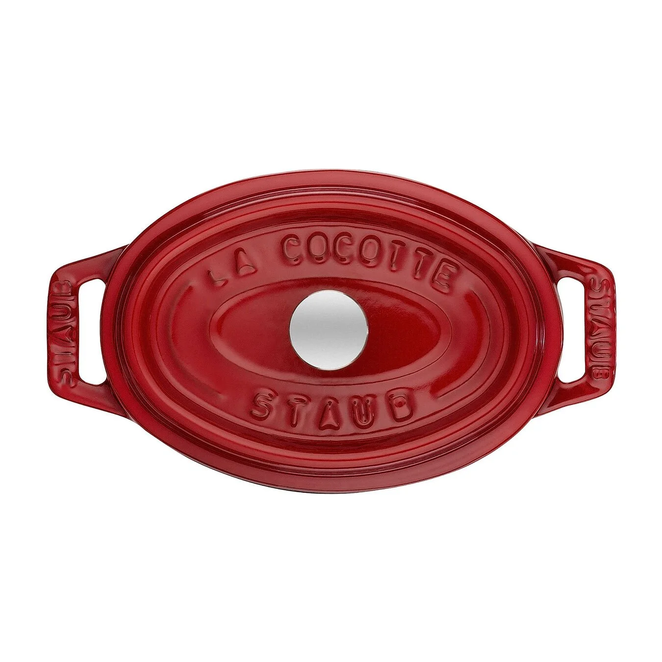 Oval mini cocotte i rødt støbejern. Mini cocotten måler 11 cm i diameter.