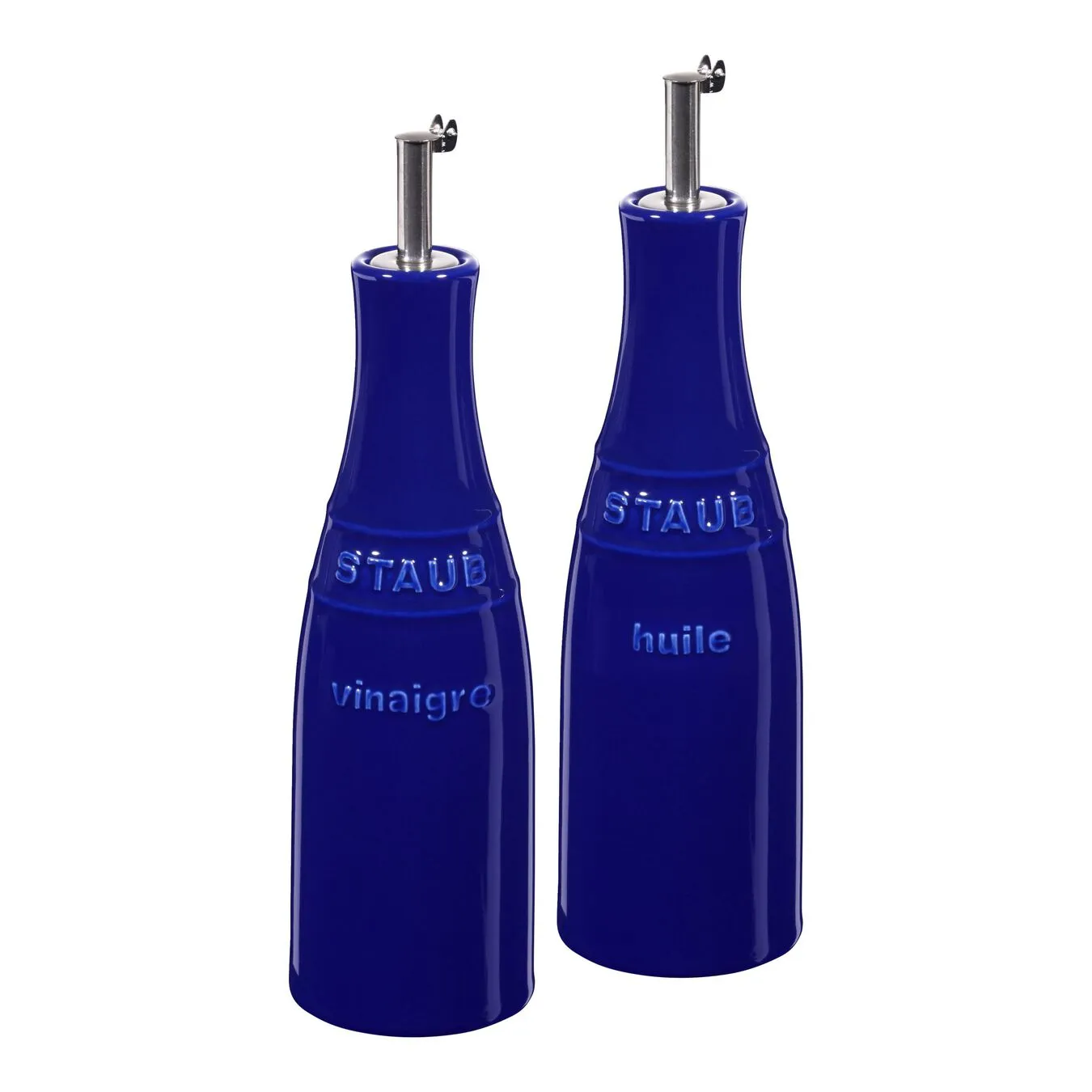 Olie-/eddikesættet i stentøj fra Staub er et anvendeligt tilbehør på ethvert middagsbord. Du kan stilfuldt præsentere olivenolie eller solsikkeolie og eddike i de mørkeblå stentøjsflasker for dine gæster, så de selv kan mikse deres egen dressing til en sprød salat.
