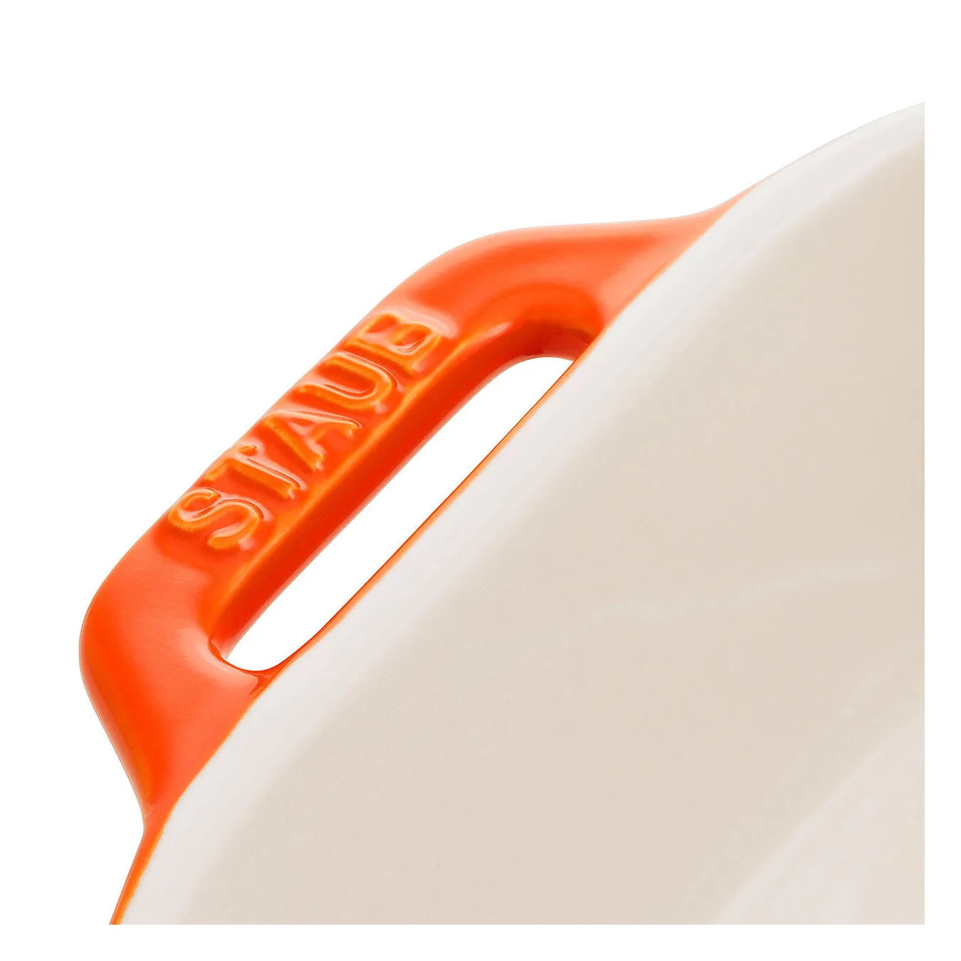 Fadets overflade er yderst hygiejnisk og nem at rengøre. Fadet kan stables sammen med andre fade fra Staub for pladsbesparende opbevaring. Nyd lækre ovnbagte måltider med dette orange fad fra Staub.