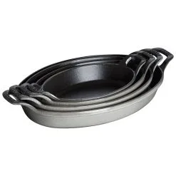 Fadet måler 30,5 x 17,8 cm og har en volumen på 1 liter. Det er nemt at vedligeholde og rengøre efter brug. Håndtagene på hver side af fadet gør det desuden lettere at holde og manøvrere rundt i køkkenet. Servér delikate ovnbagte retter eller kød med en smuk stegeskorpe lavet i dette attraktive og praktiske støbejernsfad fra Staub.