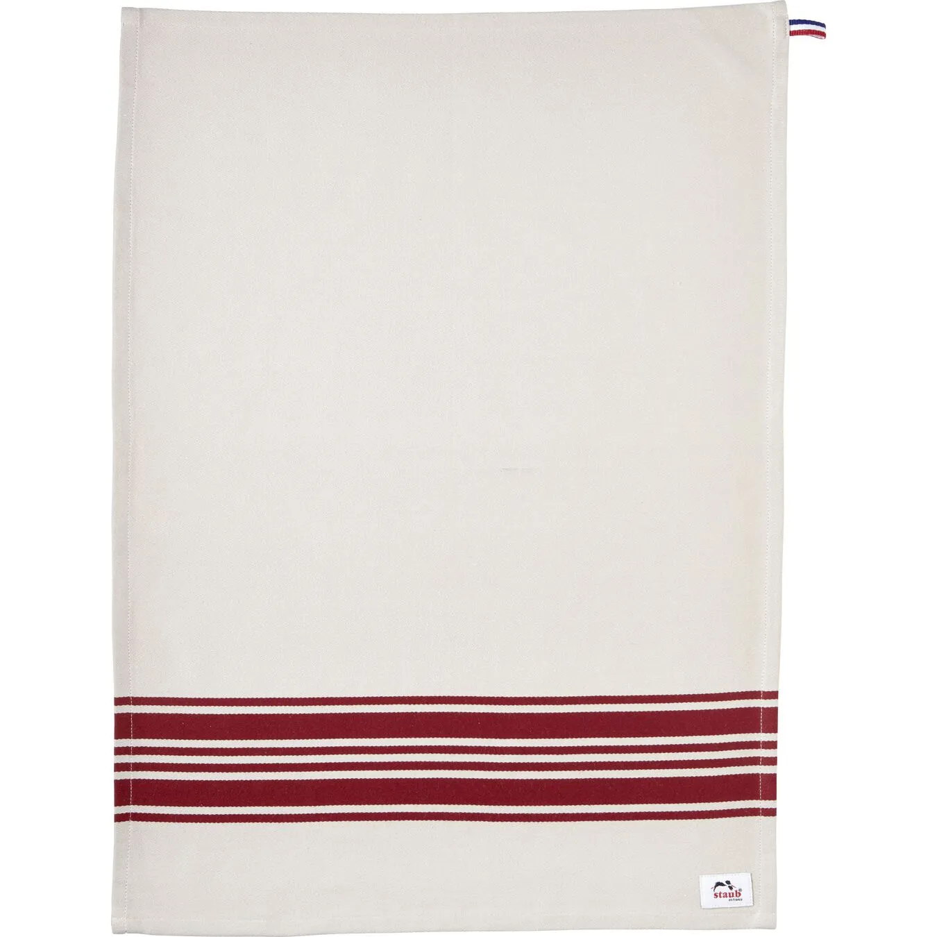 STAUB viskestykket på 50 x 70 cm er en fantastisk hjælper til køkkenet. I den anerkendte STAUB-kvalitet klarer det alle de opgaver, det er designet til, med bravur: Tørring, aftørring, polering. Det er desuden fremstillet af særligt absorberende, ren bomuld og fremstillet til at holde længe: I det ene hjørne er der en fast syet, praktisk bøjle, og sømmene er foldet om på alle fire sider. Det tidløse og sofistikerede design er også en særlig omtale værd. De varme, kirsebærrøde striber skaber en fin kontrast til det naturhvide stof og passer lige så godt ind i et landhuskøkken som i et minimalistisk køkkenkoncept eller et funktionelt professionelt køkken. En diskret etiket med STAUB-logoet angiver producenten, og det lille flag i de franske trikolorefarver fortæller om designets oprindelse. Under alle omstændigheder vil STAUB-viskestykket med garanti pynte i ethvert køkken.