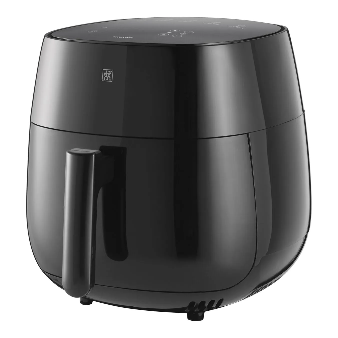 ZWILLING Airfryer tryller lækre retter frem på ingen tid. Sprøde pommes frites, pizza, muffins og meget mere kan nemt tilberedes i den. Du kan stege i varmluftsfrituren uden fedtstof/olie eller med en smule fedtstof, men også tilberede og bage i frituregryden. På LED-touchskærmen kan du vælge seks forudindstillede programmer til pommes frites, kylling, rejer, fisk, pizza og kage. Temperatur og tid kan dog også indstilles manuelt. Den medfølgende opskriftsbog giver flere lækre ideer, som du kan afprøve i frituregryden. Når den valgte tilberedningstid er udløbet, lyder et signal, og varmluftfrituren afslutter tilberedningen automatisk. Med en kapacitet på 4 liter har du nok plads i kurven selv til større portioner. Kurv og rist tåler opvaskemaskine. Med luftfrituren er der intet spildfedt at bortskaffe, hvilket gør den særligt praktisk til hverdagsbrug.
