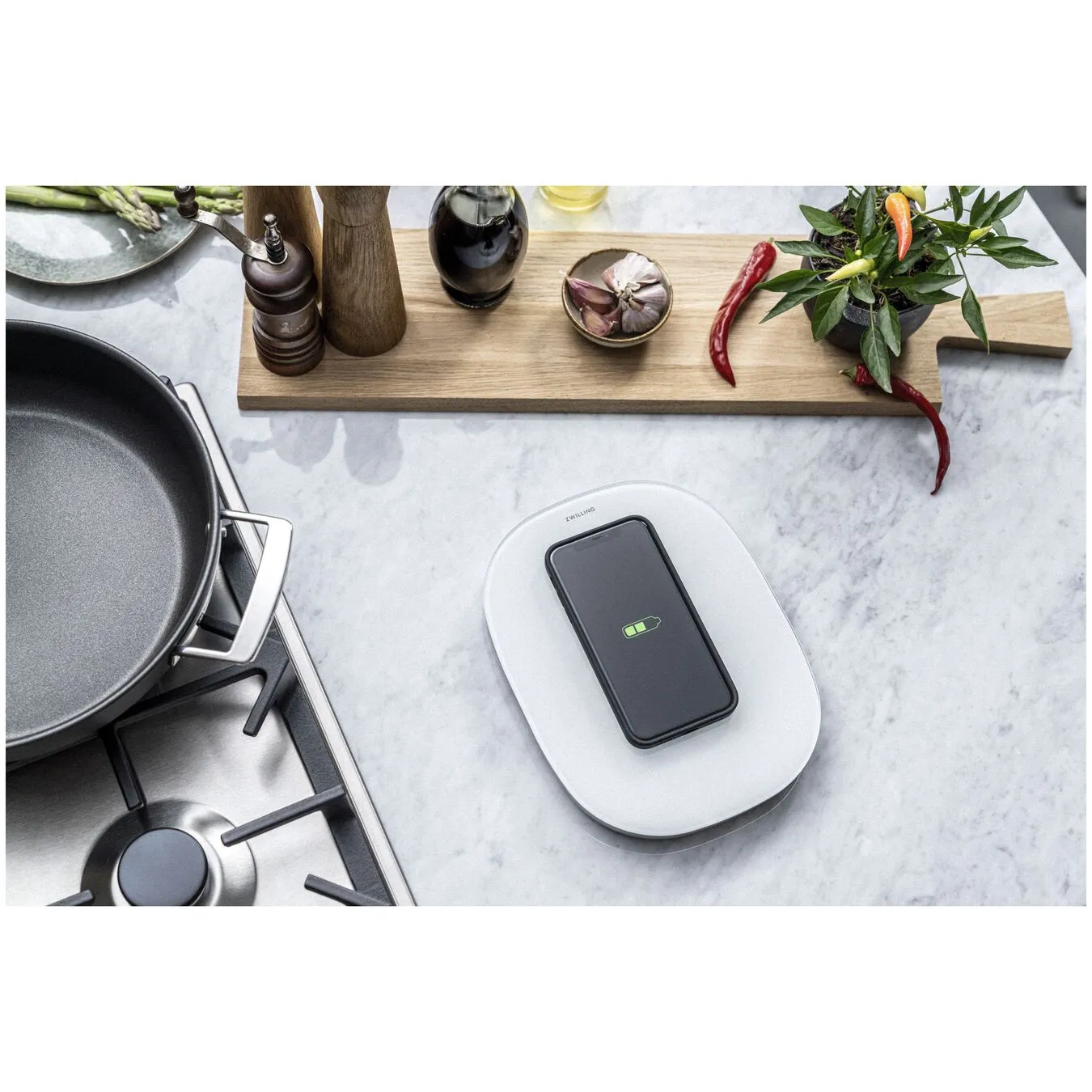 En vægt, der giver dig mere end blot præcist afmålte ingredienser: Den digitale køkkenvægt ZWILLING ENFINIGY i sølv med induktiv opladningsfunktion, f.eks. til smartphones, kombinerer smarte funktioner med nem håndtering.