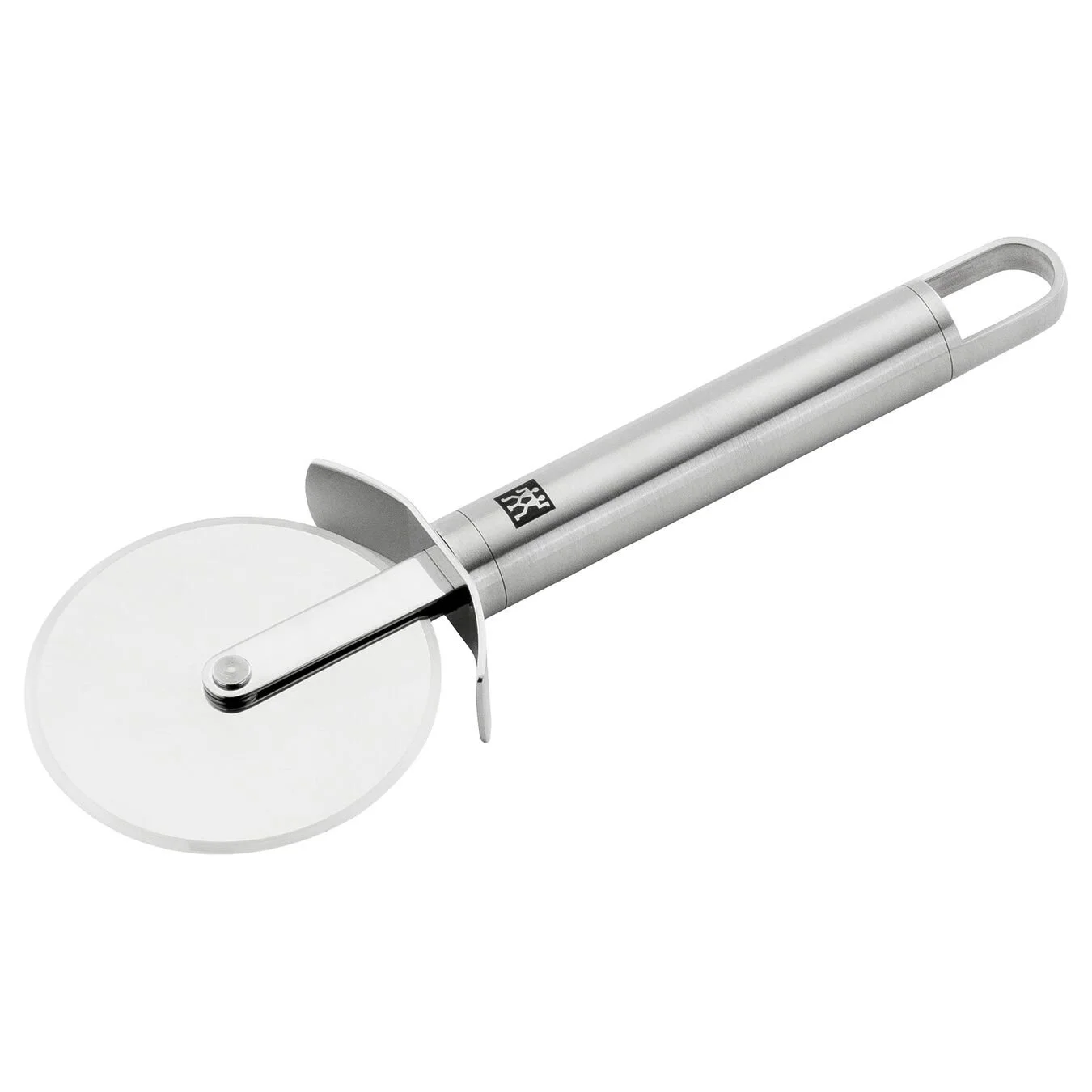 Skarp pizzaskærer i rustfrit stål med ergonomisk håndtag samt fingerbeskytter.