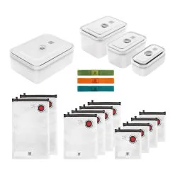 Takket være vakuumet er æskerne lufttætte og lækagesikre. Sættet indeholder tre elastikbånd, så æskerne kan lukkes pålideligt, selv efter brug, når vakuumet er sluppet ud. Du skal blot vikle en af dem rundt om æsken, og så er låget forseglet igen. Det sidste højdepunkt i sættet er vores eksklusive ekstraudstyr: ti FRESH & SAVE vakuumposer i størrelserne S, M og L. De genlukkelige vakuumposer til fødevarer er ikke kun ideelle til opbevaring – de er også perfekte til marinering under vakuum og sous-vide-tilberedning.
